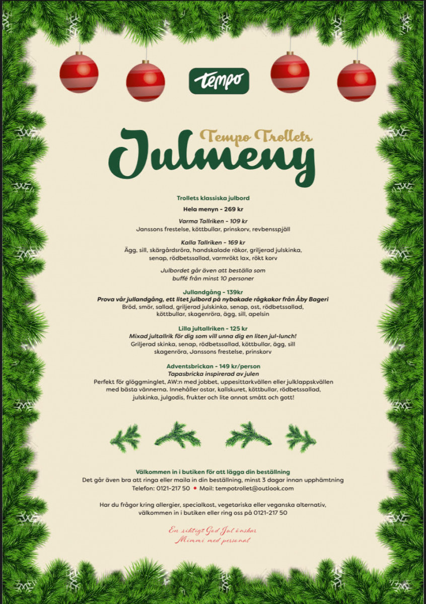Låt årets julbord bli något extra med Tempo Trollets utsökta julmeny. Oavsett om du önskar ett klassiskt julbord, en mysig julfika, en lättare jultallrik eller en festlig adventsbricka har vi något som passar varje tillfälle.